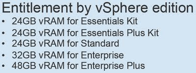 * We’ve increased vRAM entitlements for all vSphere editions, including the doubling of the entitlements for vSphere Enterprise and Enterprise Plus. Below is a comparison of the previously announced and the new vSphere 5 vRAM entitlements per vSphere edition: